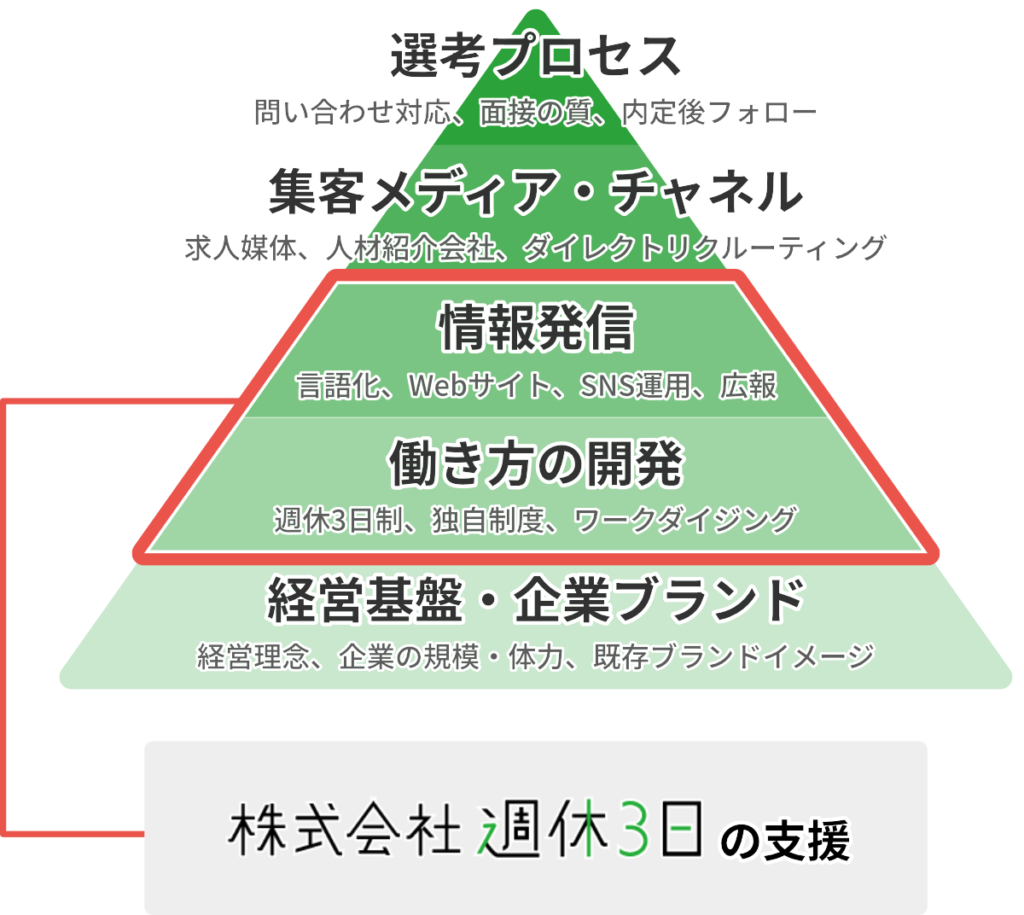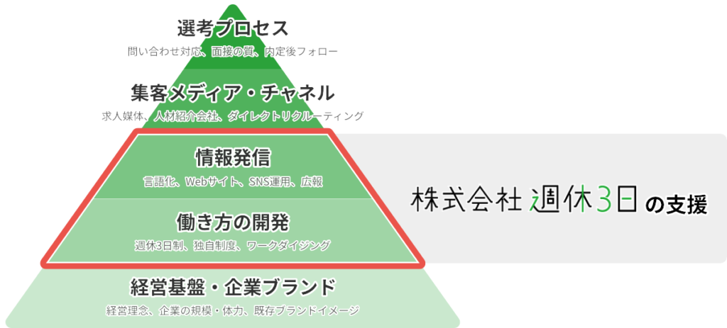 地方や、中小企業だからこそ週休3日制は活用すべきです。経営者が好きではない社名で生き残っているからこそ、株式会社週休3日には他社にはないノウハウと経験があります。採用で悩む企業がやるべきは2つです。