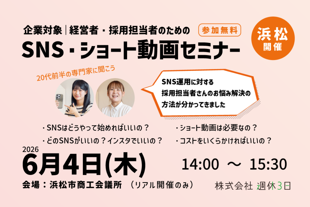 このセミナー・イベントは終了しています。関連セミナー 【浜松開催】経営者・採用担当者のためのSNS・ショート動画セミナーSNSショート動画一般企業自治体2026年06月04日(木) 14:00〜15:30 ※開場13:30 採用に苦しむ採用担当者に最適化したSNS運用・ショート動画セミナーです。もちろん経営幹部の方のご参加も大丈夫です。 詳細を見る その他のセミナーをみる