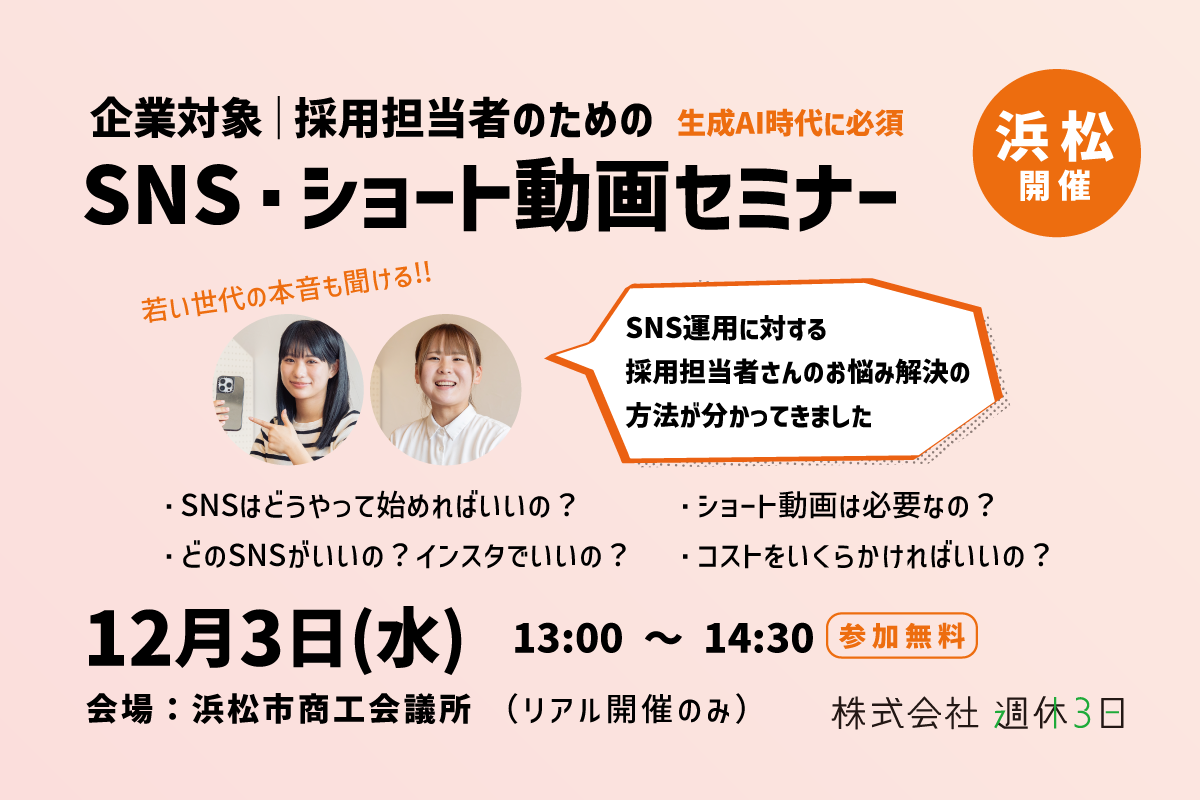 「どのSNSを使えば効果的?」「ショート動画って本当に必要?」「コスト感は?」そんな“いまさら聞けないSNSの始め方”を、わかりやすく・楽しく・リアルにお伝えします。採用担当者が“苦しまないSNS運用”の始め方を、具体的な事例とともにご案内します。