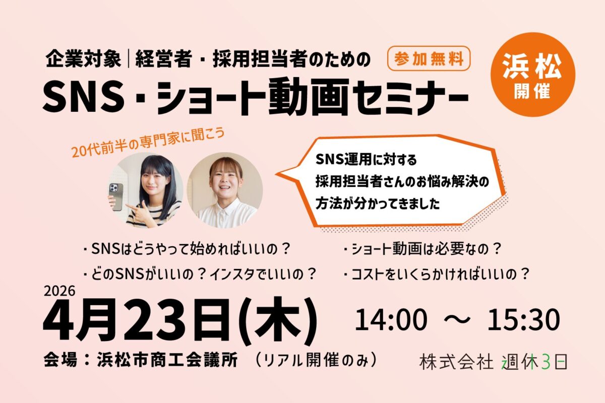 「どのSNSを使えば効果的?」「ショート動画って本当に必要?」「コスト感は?」そんな“いまさら聞けないSNSの始め方”を、わかりやすく・楽しく・リアルにお伝えします。採用担当者が“苦しまないSNS運用”の始め方を、具体的な事例とともにご案内します。