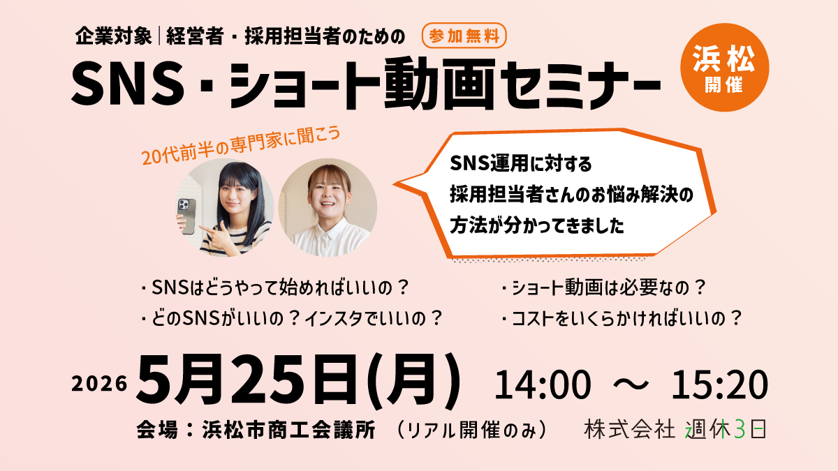 「どのSNSを使えば効果的?」「ショート動画って本当に必要?」「コスト感は?」そんな“いまさら聞けないSNSの始め方”を、わかりやすく・楽しく・リアルにお伝えします。採用担当者が“苦しまないSNS運用”の始め方を、具体的な事例とともにご案内します。